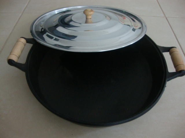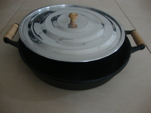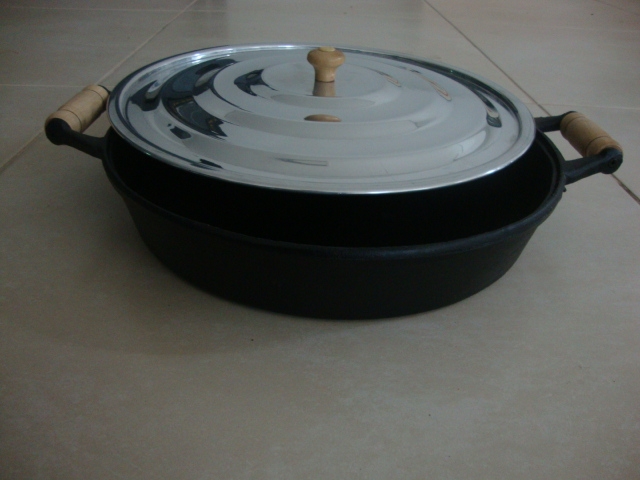 DESCRIMINAÇÃO : BIFEIRA EM FERRO FUNDIDO COM TAMPA DE ALUMINIO, PARA QUALQUER TIPO DE FRITURAS, BIFF NA CHAPA,FUNDO RETO BOM APROVEITAMENTO DO ESPAÇO.